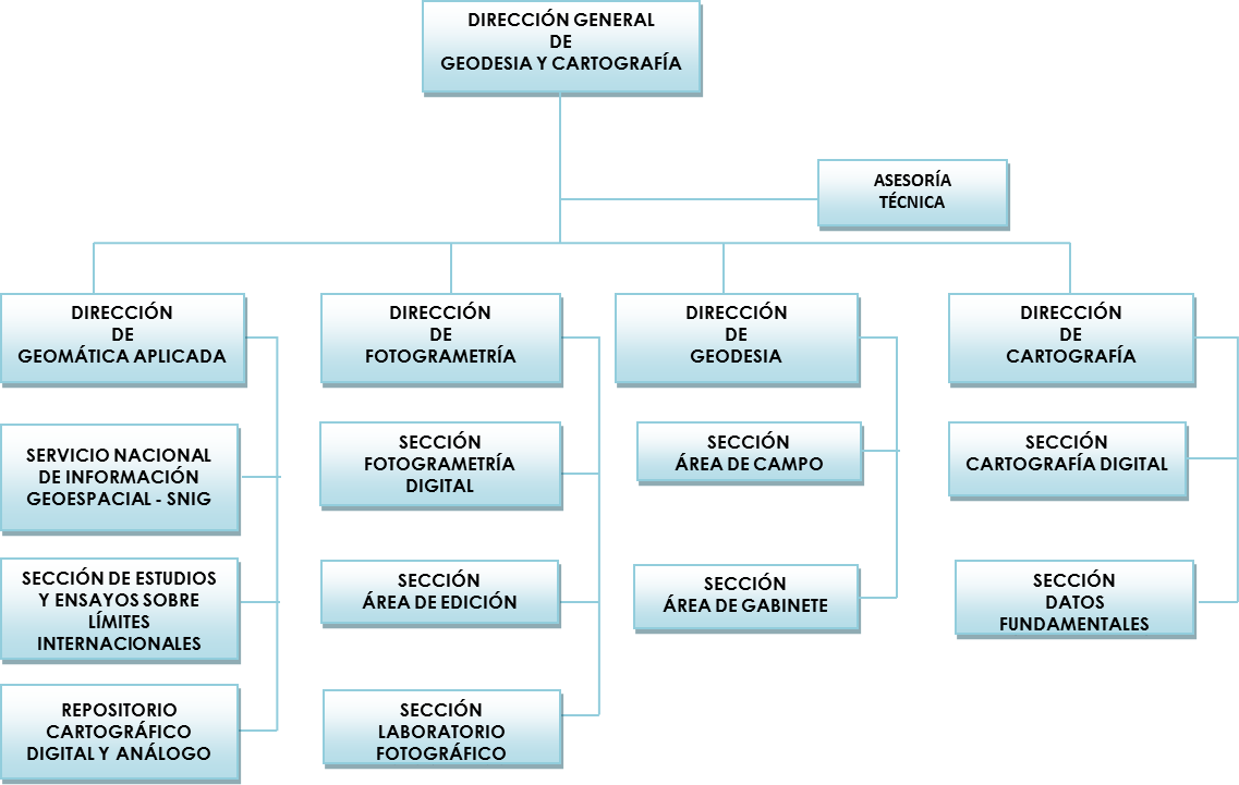La Dirección General de Geodesia y Cartografía (DGGC), de conformidad a la ley No. 311, Ley Orgánica del Instituto Nicaragüense de Estudios Territoriales (INETER), es responsable de coordinar, promover, desarrollar y regular la realización de los trabajos geodésicos, cartográficos y fotogramétricos en el territorio nacional. La Dirección General esta conformada por: 1 (Una) oficina de Asesoría Técnica y 4 (cuatro) Direcciones Específicas; Geodesia, Fotogrametría, Cartografía y Geomática Aplicada, las que a su vez ejercen sus funciones a través de los especialistas distribuidos en 10 (diez) áreas técnicas o secciones.