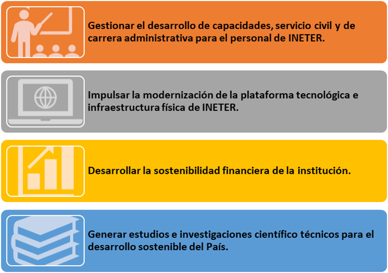 INETER como el organismo técnico y científico relevante del Estado, generando y poniendo a disposición de toda la sociedad, información básica (Cartográfica , Catastral , Meteorológica , Hidrológica , Geológica y otras) y los estudios e investigaciones del medio físico que contribuyan al desarrollo socioeconómico y a la disminución de la vulnerabilidad ante desastres naturales y vigilando permanentemente a los fenómenos naturales peligrosos.